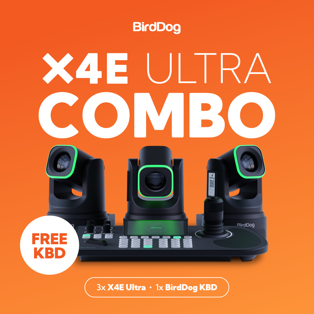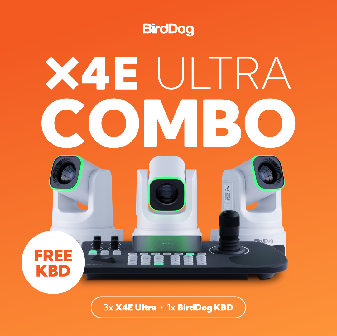 Built for environments where stability matters most, the X4E Combo includes 3× X4E cameras and the BirdDog KBD Controller for precise, pro-level control. Delivering the same outstanding image quality and performance as X4 Ultra—without Wi-Fi or battery—this bundle is optimized for fixed installs and rock-solid wired production. Get yours today for $5,985 USD.