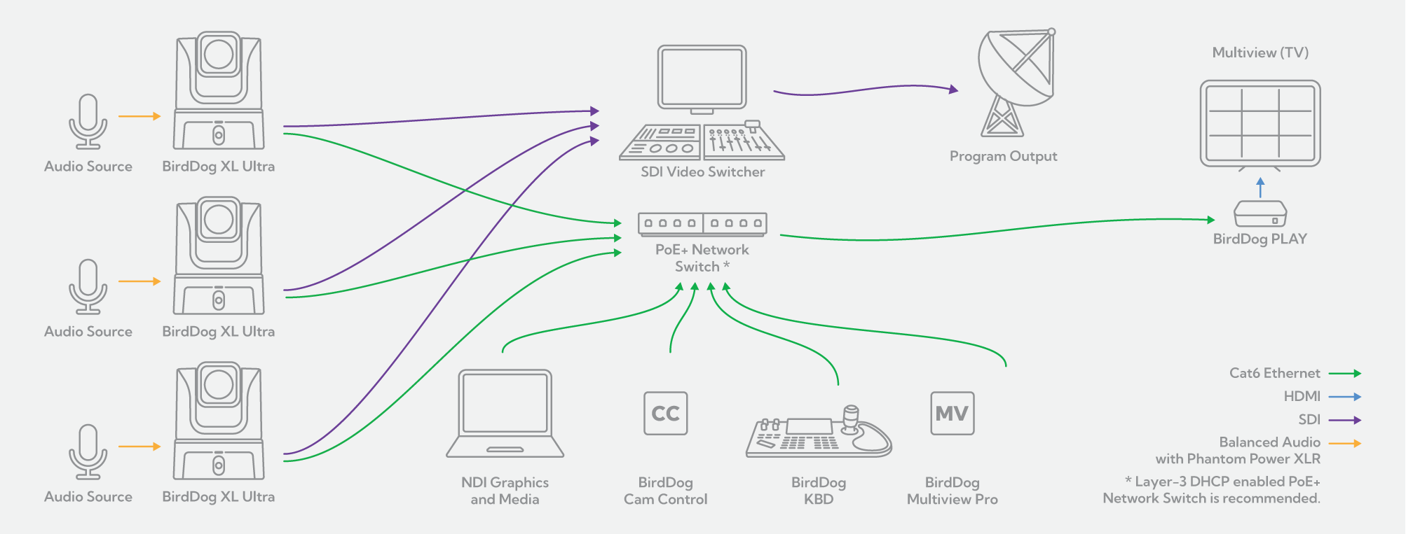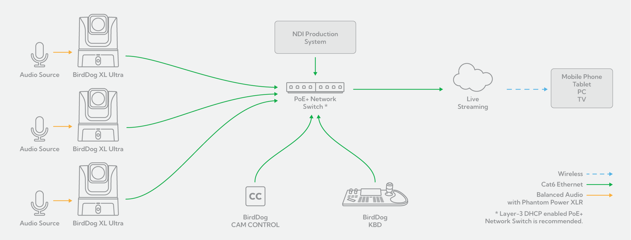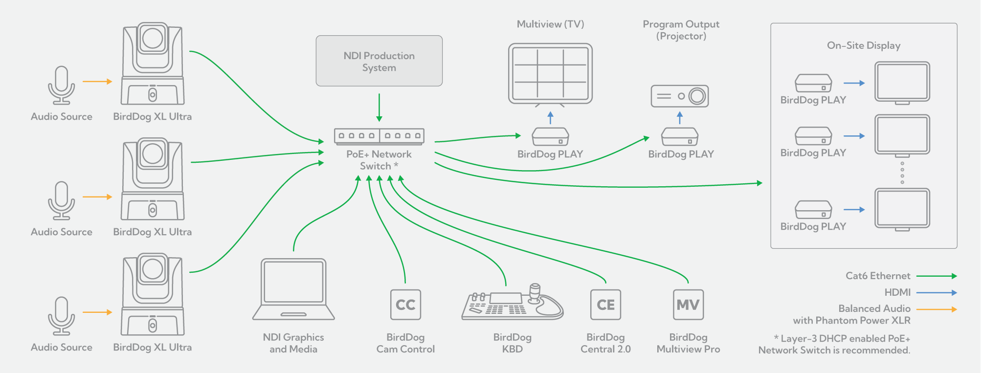 Sometimes less IS really more! BirdDog and NDI® make single cable connectivity a reality. Your camera placement no longer needs to be dictated by power or control access requirements. Now you can mount your XL Ultra exactly where needed from the best production standpoint. A single Ethernet cable is all you need to receive UHD images and pristine audio FROM your camera, as well as send control and power TO your camera. Use our free Cam Control software to dial exactly the look you want using comprehensive colour, exposure and noise reduction tools. For productions featuring a single, moving presenter, Cam Control also helps you out with adjustable facial and body tracking. Need more manual control? The BirdDog KBD gives you lowlatency pan, tilt and zoom control of your cameras, as well as Preset recall of camera Exposure, Shutter Speed, Iris, Compensation, White Balance, Focus and Zoom Speed Add BirdDog Multiview Pro software for professional multiview monitoring on a single display, and team Central 2.0 with our compact PLAY converters to direct any number of your NDI® sources, to any number of display destinations.