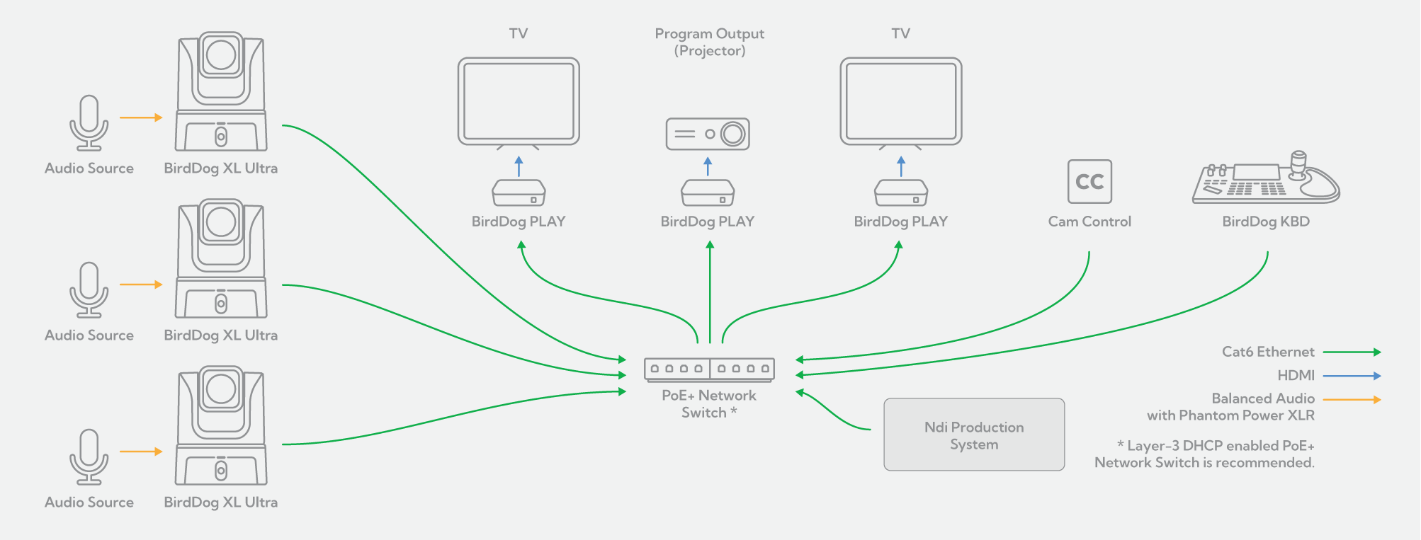 Simply connect your XL Ultra to your existing GigE switched network and deliver UHD images with crystal clear, balanced audio to your remote presentation. The bi-directional nature of NDI® means that, as stunning images and audio are busy leaving your camera, the SAME network cable can be used to provide powerful control, as well as power, TO your cameras. Use our free Cam Control software to remotely dial exactly the look you want using comprehensive colour and exposure, and noise reduction tools. Fully adjustable facial and body recognition offers reliable, automatic tracking of your talent – perfect for broadcast studios, lecturer/teacher applications, house of worship, or any time the on-air talent is moving. For more complex camera movement, the BirdDog KBD provides low-latency pan, tilt and zoom control of your XL Ultra. Easily decode your NDI® back to HDMI for final display using our compact PLAY converters. Featuring comprehensive control support via RESTful API, Crestron, Zoom API, or Q-SYS API, PLAY ensures the most professional presentation experience.